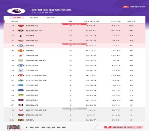 雷速体育10月27报道 英超第九轮比赛已经全部结束,积分榜方面,阿森纳22分继续领跑,伯恩茅斯第二,热刺、桑德兰分列三四位。