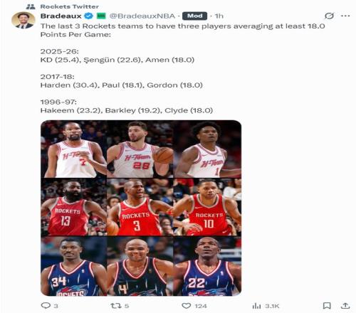 随后火记Bradeaux在写道,火箭队史有三人场均18分以上:2025-26赛季杜兰特、阿门、申京;2017-18赛季保罗、哈登、戈登;1967-97赛季奥拉朱旺、巴克利、德雷克斯勒。